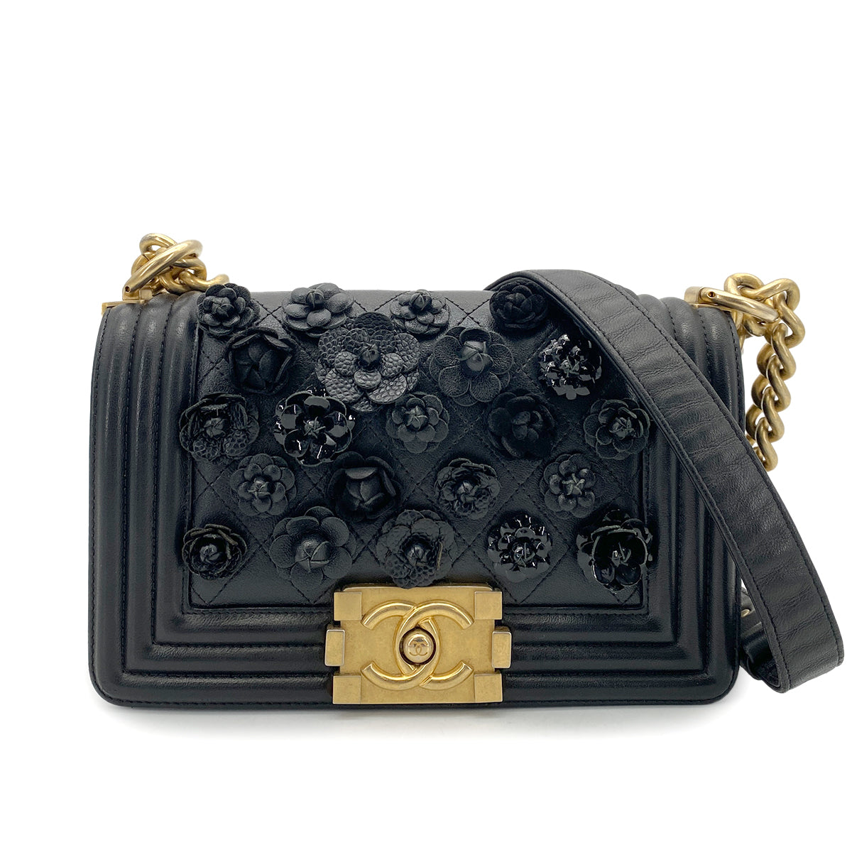 CHANEL BOY CHANEL CHAIN SHOULDER BAG CAMELLIA BLACK LAMB SKIN 90261540