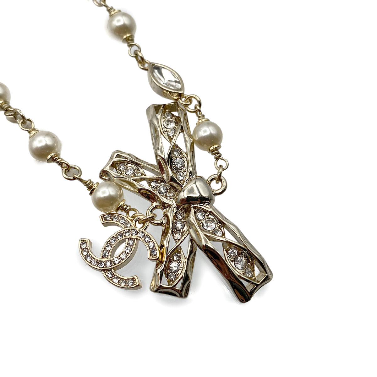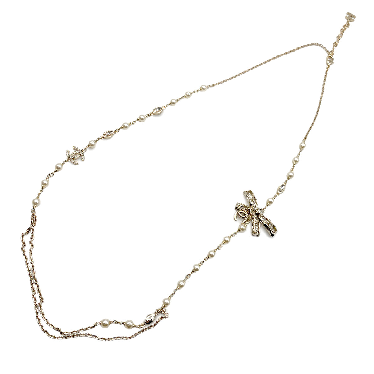 CHANEL NECKLACE COCOMARK FAUX PEARL RIBBON RHINESTONE ACCESSORY B24B 90264577