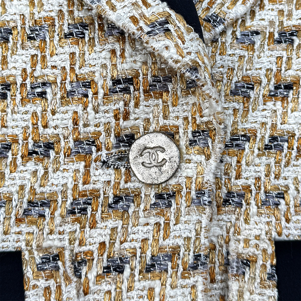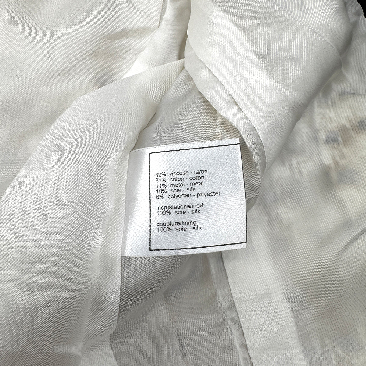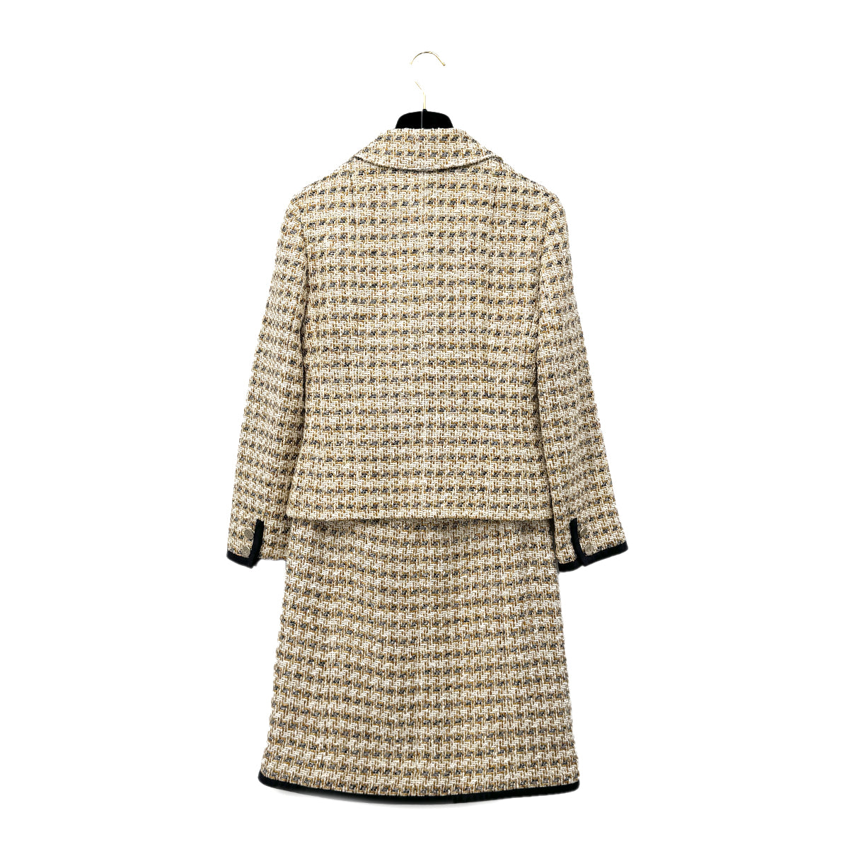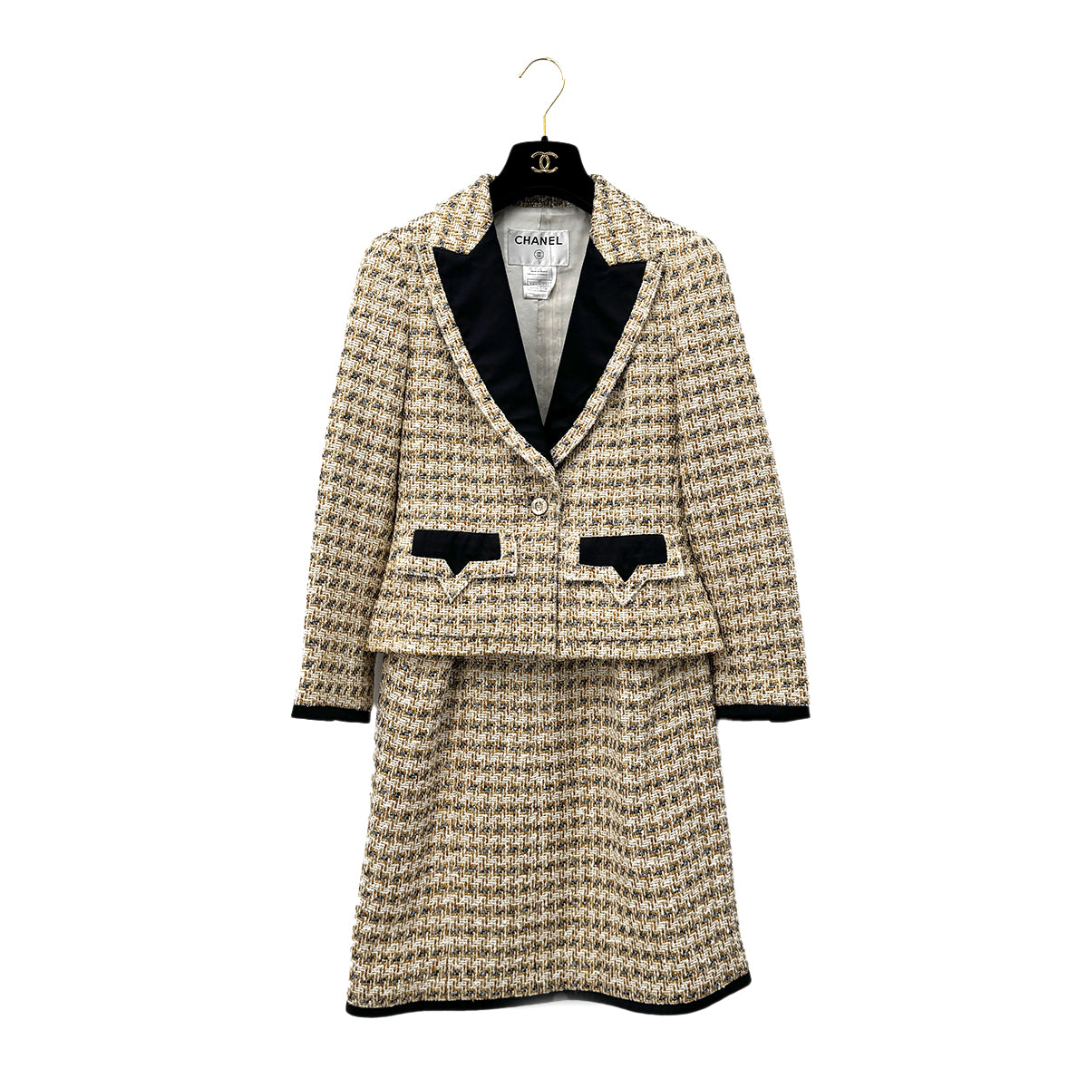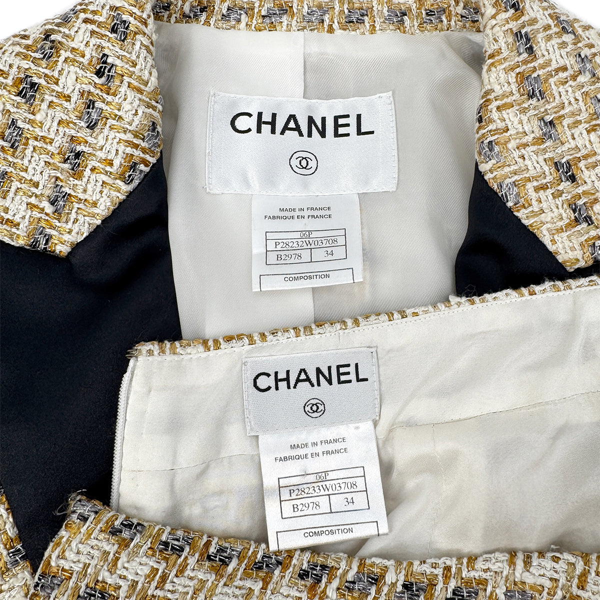 CHANEL TWEED JACKET SKIRT SET COCO BUTTON BEIGE WHITE VISCOSE 34 06P RTW 90284579