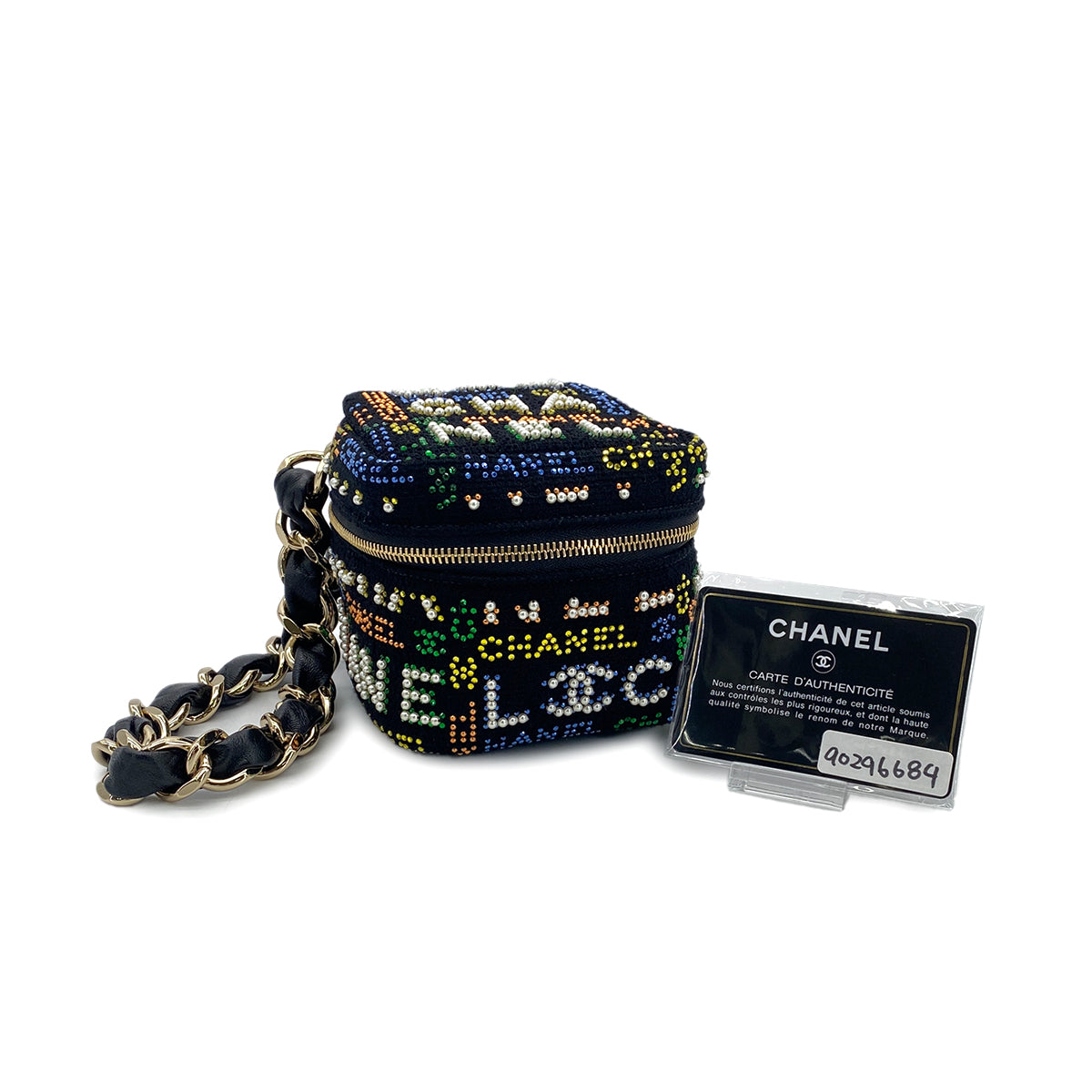 CHANEL VANITY LOGO COCOMARK RHINESTONE FAUX PEARL CHAIN HAND BAG MULTICOLOR CANVAS 90296684