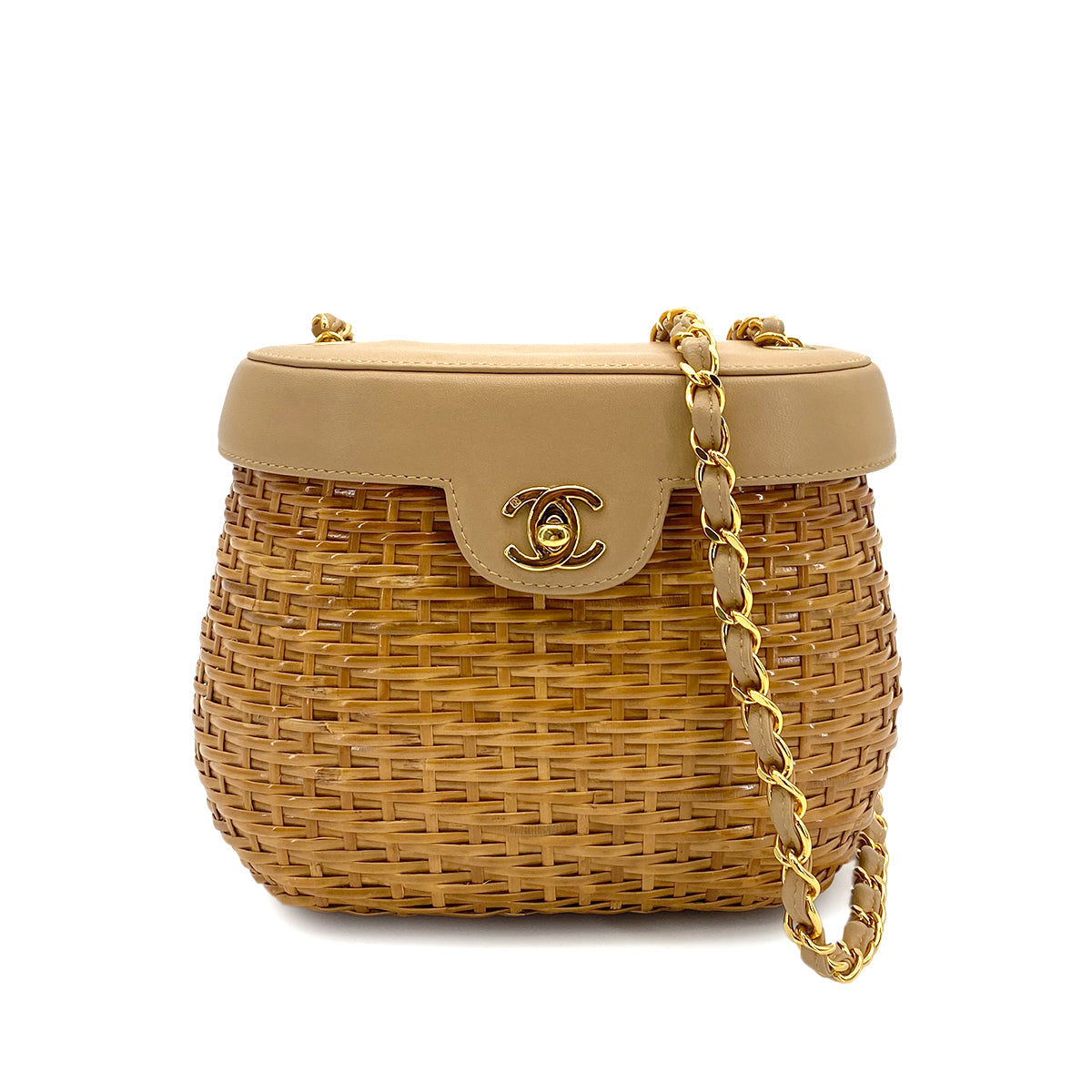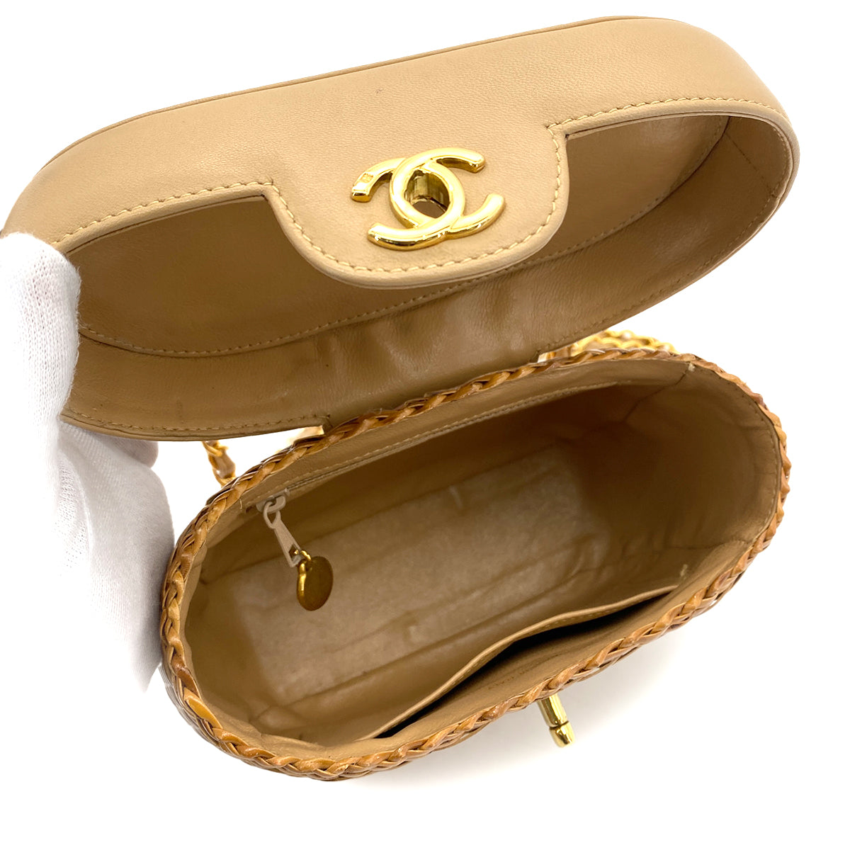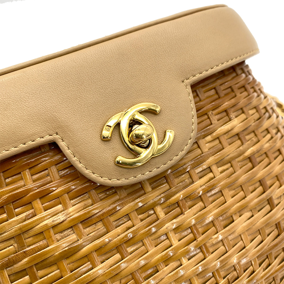 CHANEL VINTAGE CHAIN SHOULDER BEIGE BROWN RATTAN LEATHER 90251383