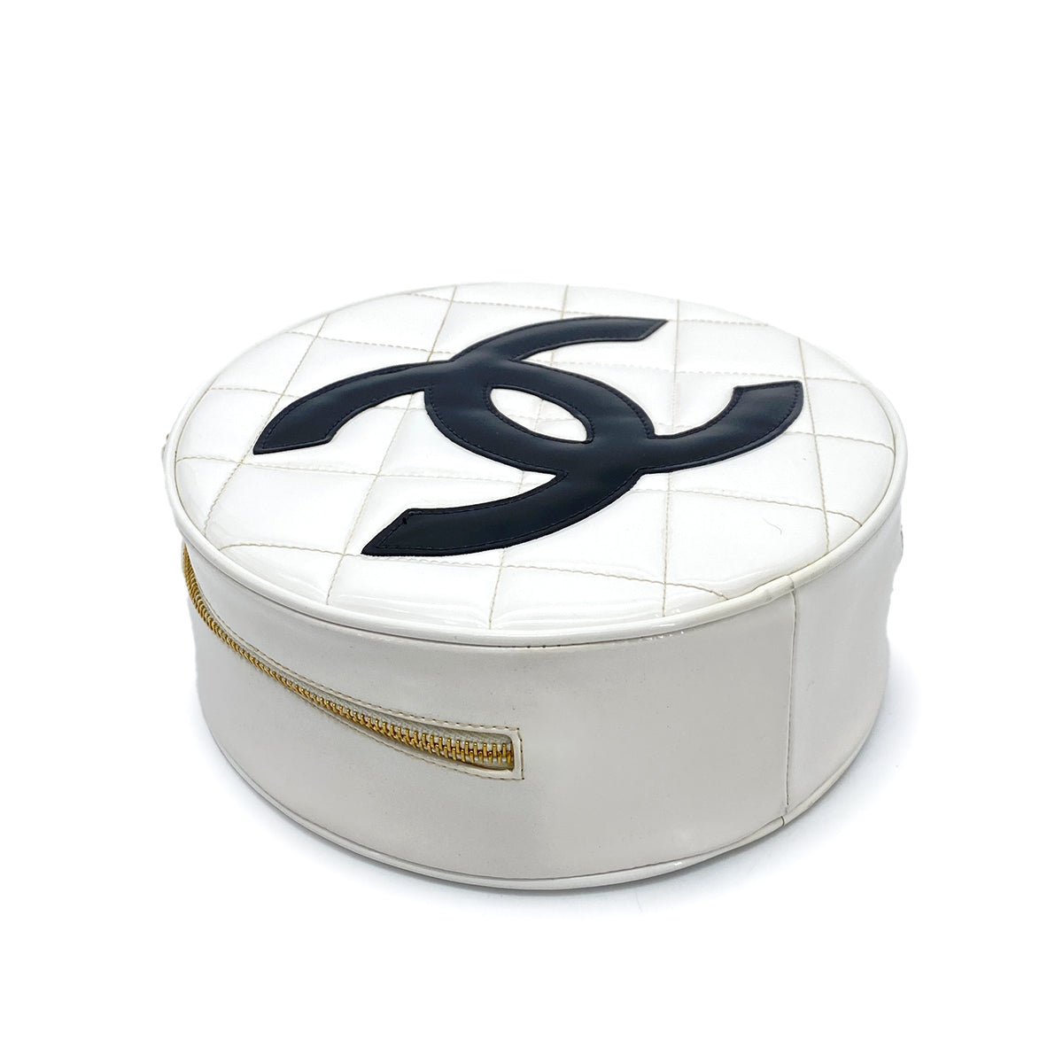 CHANEL VINTAGE ROUND VANITY HAND BAG WHITE BLACK ENAMEL 90260133