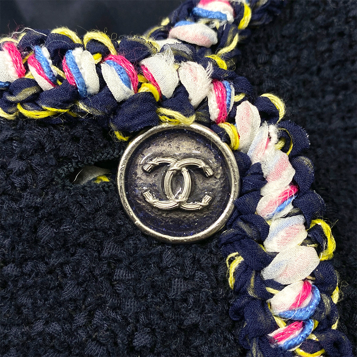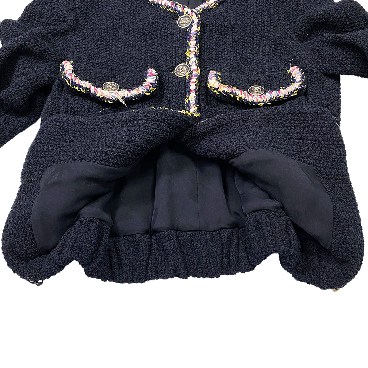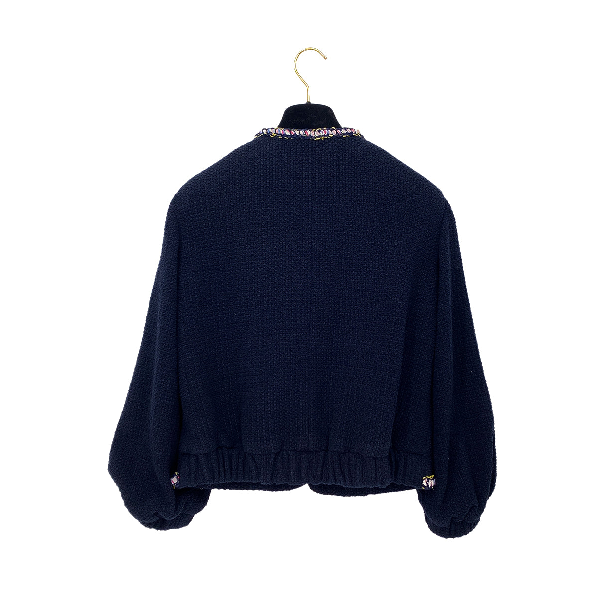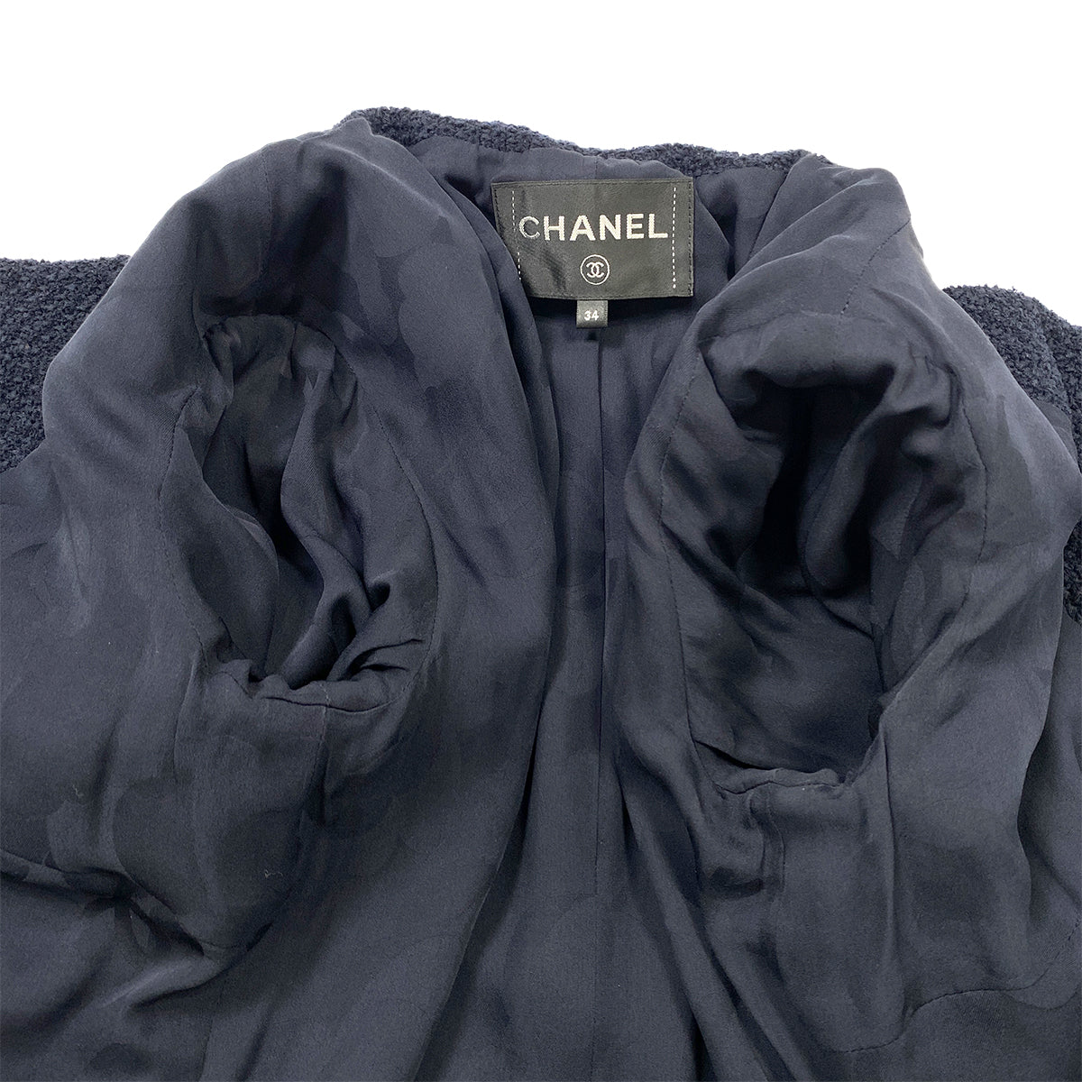 CHANEL COCO BUTTON NO COLLAR TWEED JACKET NAVY COTTON 34 P70 RTW 90286877