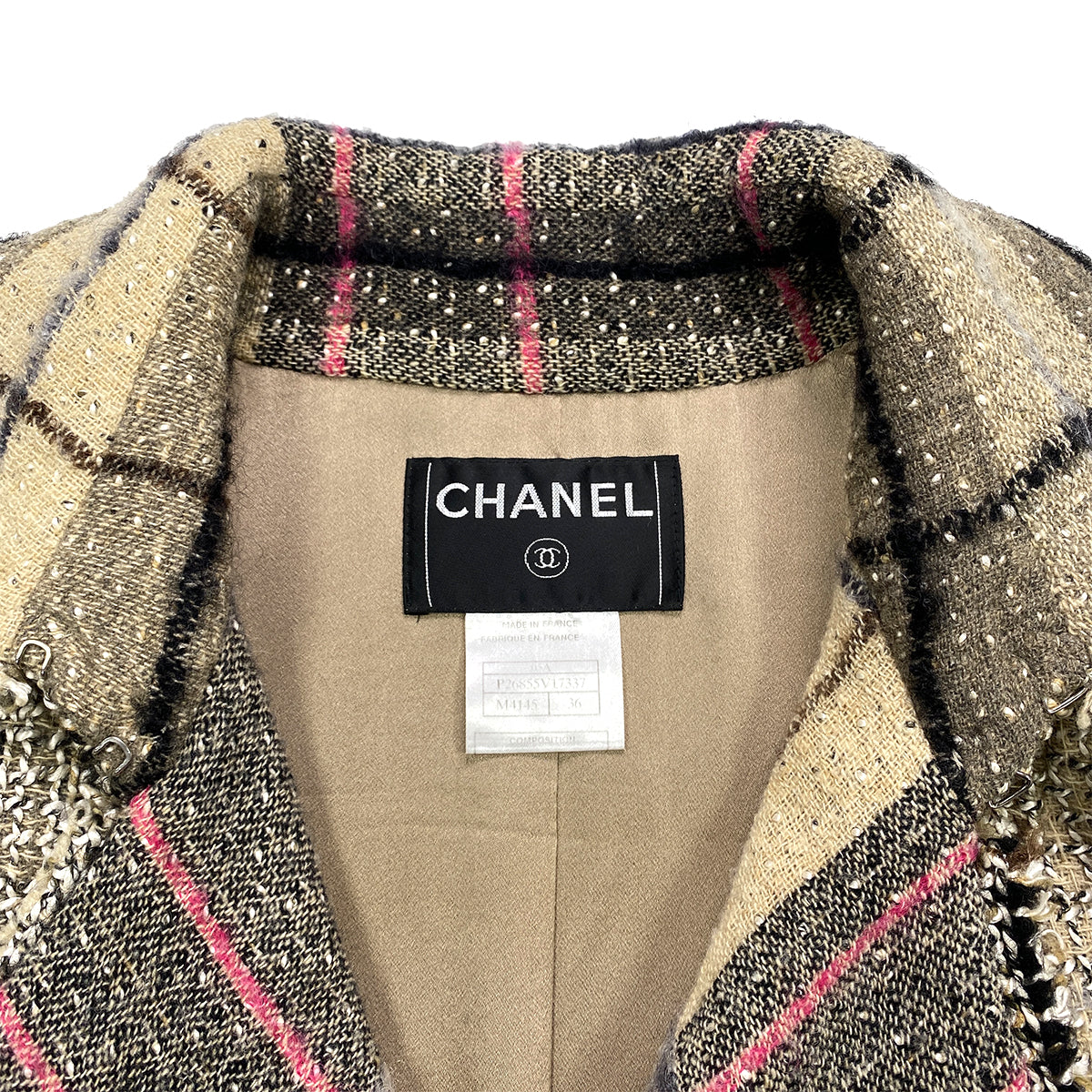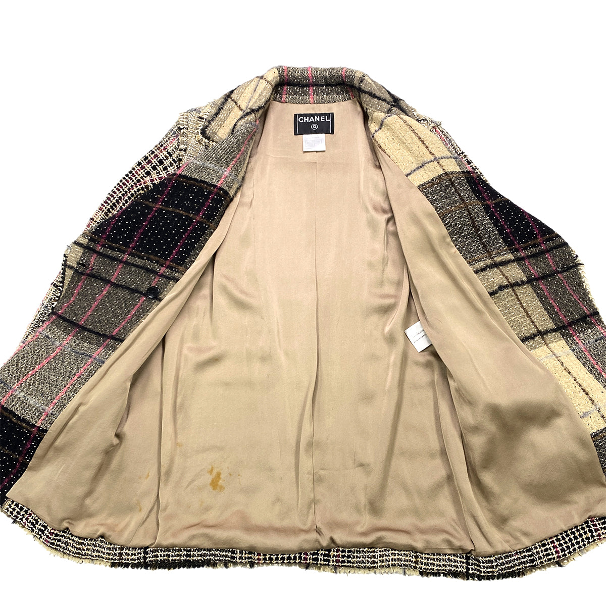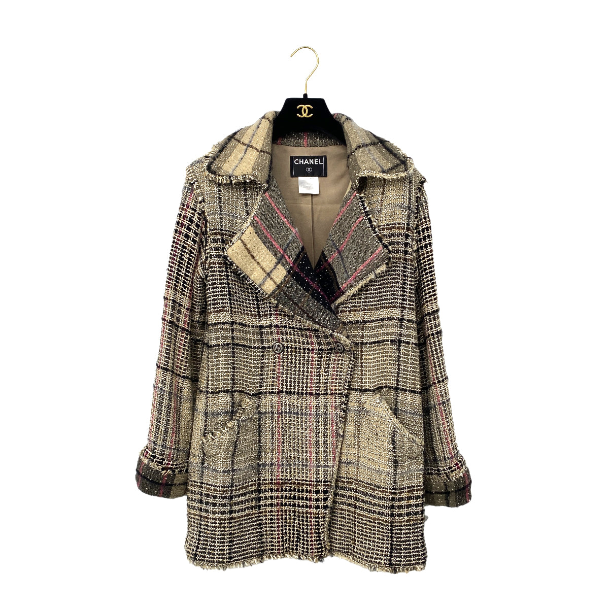 CHANEL TWEED PLAID COAT JACKET COCO BUTTON BEIGE WOOL 36 05A RTW 90283645